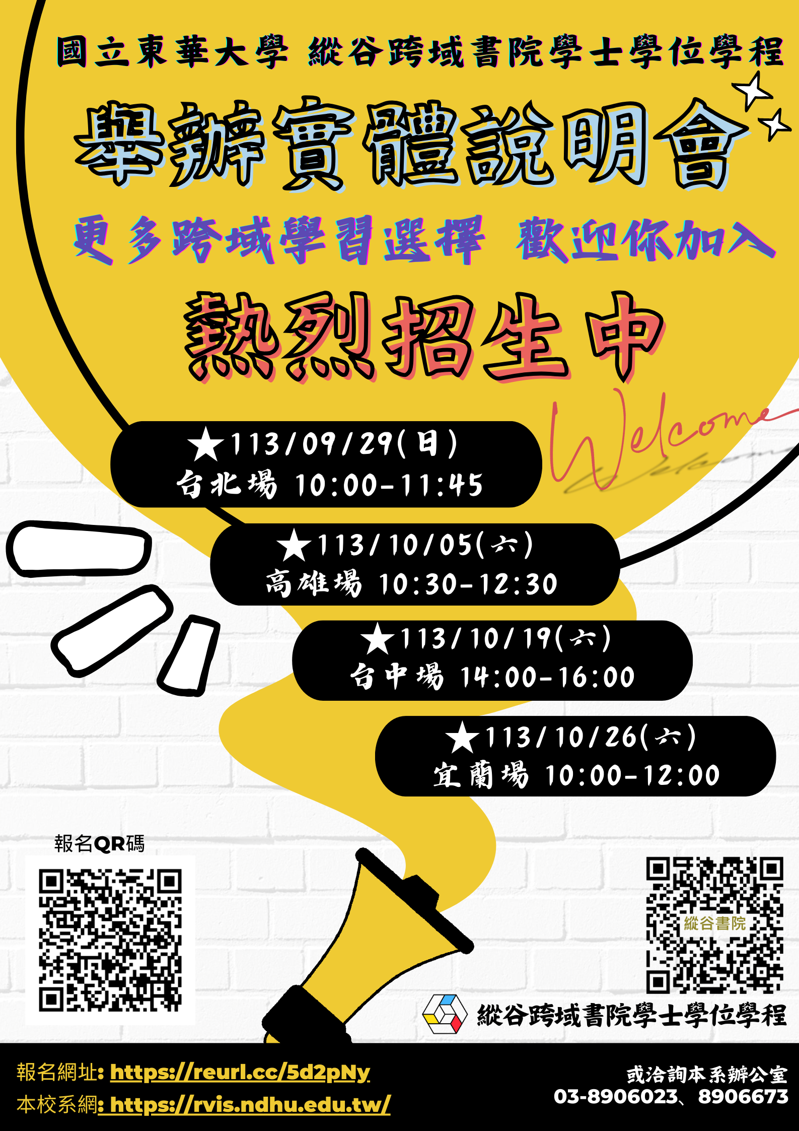 一、在這個快速變動的時代,「跨領域」有如回應社會需求的一把鑰匙,縱谷跨域書院學士學位學程,希望透過「專題發展專業」的育才模式,引領學子開發自我潛能與生命價值,成為「自覺」、「自主」、「自信」的跨領域人才。114學年度招生說明會開跑,報名相關資訊如下: