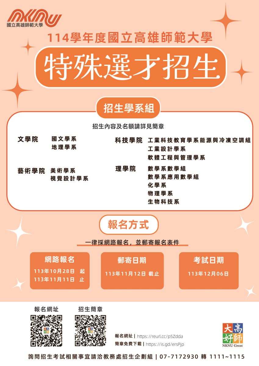 國立高雄師範大學114學年度大學「特殊選才」招生資訊